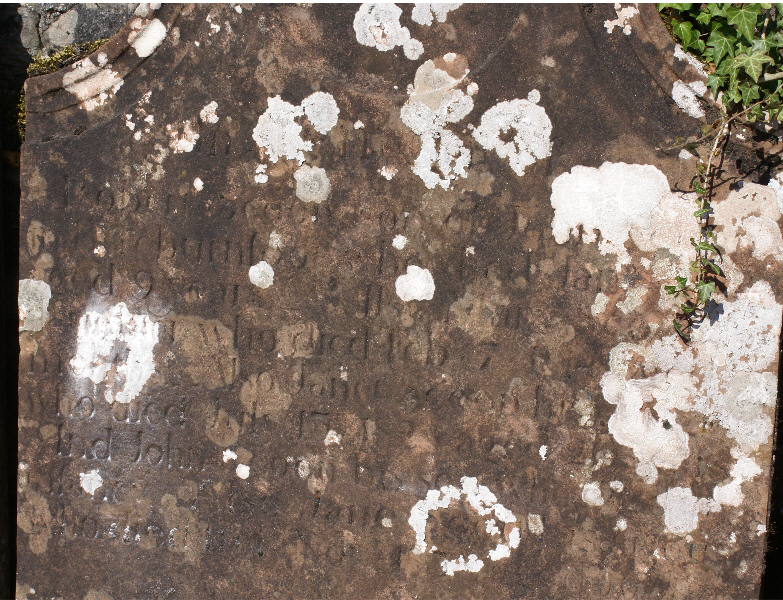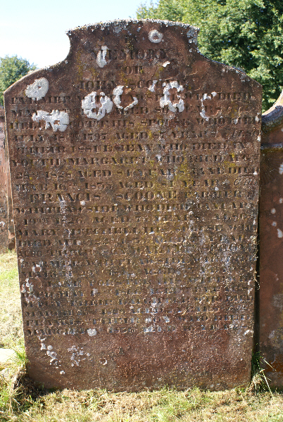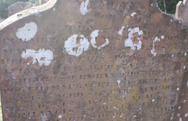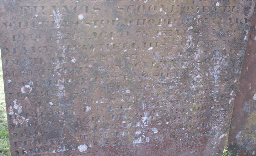 2. In memory of John Scoone Farmer Whitlawside who died May 20 1790 aged 80 years and Helen Scott his spouse who died July 18th 1797 aged 87 years also their issue Jean who died in youth Margaret who died Aug 28 1828 aged 81 years Jane died June 16th 1835 aged 81 years; and Francis Scoone farmer in Whitlawside who died January 19th 1826 aged 75 years also Mary Mitchell his spouse who died August 22nd 1835 aged 75 years; also their son Walter Scoone farmer Whitlawside who died March 29th 1842 aged 53 years and Jane Forster his wife who died May 18th 1806 aged 76 years also Mary their daughter who died March 25th 1829 aged 2 years and Frank their son who died March 16th 1836 aged 16 years Stone Text (John) Text (Francis)