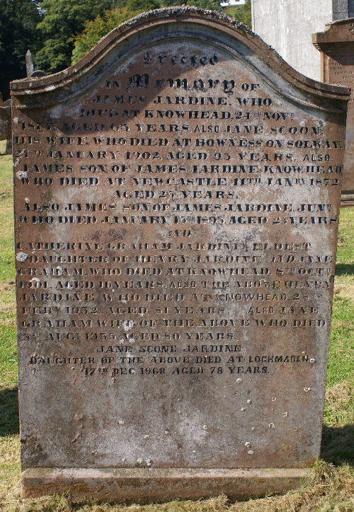 4. Erected in memory of James Jardine who died at Knowhead 24 Nov 1877 aged 65 years also Jane Scoon his wife who died at Bowness on Solway 27th January 1902 aged 93 years also James Jardine Knowhead who died at Newcastle 11th Janry 1872 aged 25 years also James Jardine son of James Jardine Junr who died January 15th 1895 aged 25 years and Catherine Graham eldest daughter of Henry Jardine and Jean Graham who died at Knowhead 8th Octr 1901 aged 16 years also the above Henry Jardine who died at Knowhead 28th Feby 1952 aged 81 years. Also Jane Graham who died 5th Augt 1936 aged 80 years. Jane Scone Jardine daughter of the above died at Lochmaben 17th Dec 1968 aged 78 years. Stone